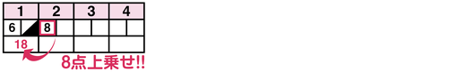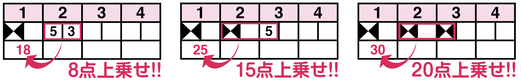 ストライクを出すと、次の2投の合計点がまるごと上乗せされます。さらにストライクが続けば続くほど、加点が重なってスコアはどんどん伸びていきます。